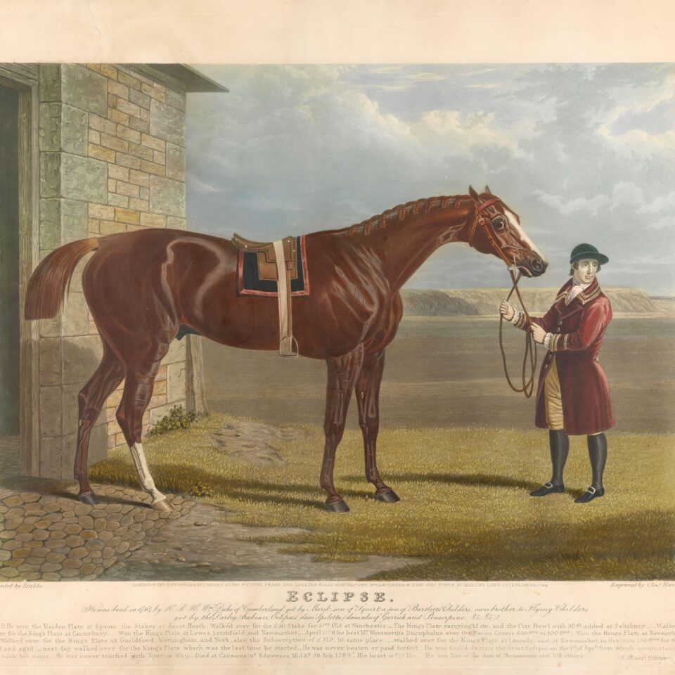 George Stubbs (1724-1806), widely acclaimed as Britain’s greatest equine artist, painted Gimcrack on Newmarket Heath. The painting hangs in the Jockey Club rooms at Newmarket. Stubbs also famously painted Eclipse, born in 1764, the second truly great racehorse in the history of the Turf.